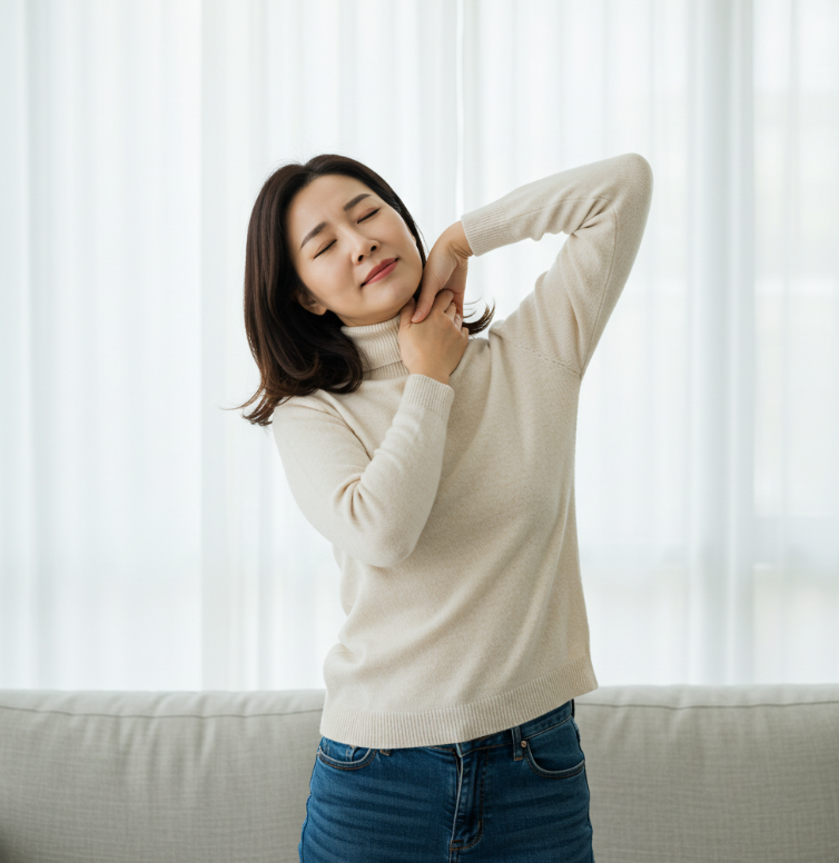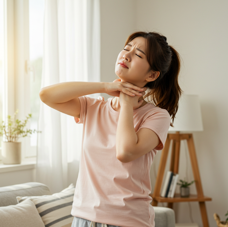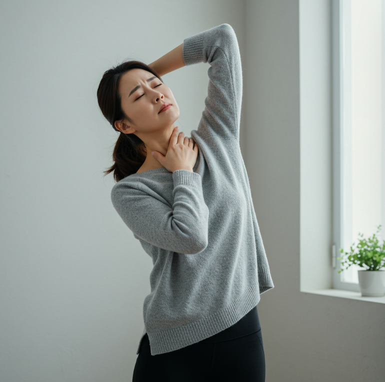 - 주의사항: 목 디스크가 의심되는 경우 이 동작은 피하고, 전문가와 상담하세요. 통증이 있다면 즉시 중단합니다.