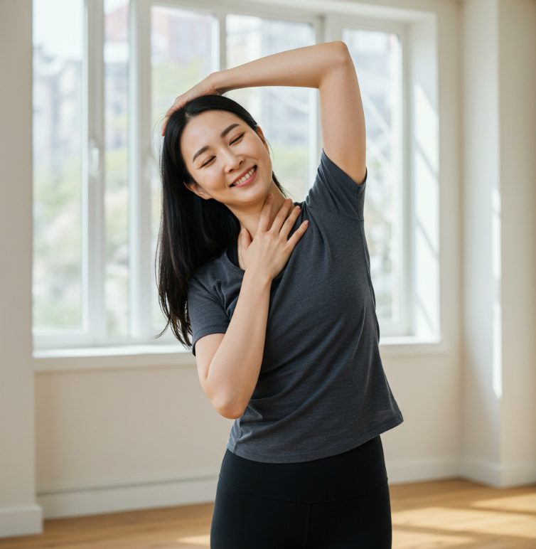 - 방법: 양손을 등 뒤에서 깍지 끼고, 어깨를 뒤로 젖히며 가슴을 활짝 펴세요. 견갑골이 서로 가까워지는 느낌을 10초간 유지합니다. 천천히 풀고 반복합니다.